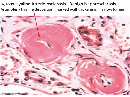 사구체막의 비후, 간충직세포 비후, 혈관 탄력성을 잃고 두꺼워짐 hyaline arteriosclerosis= 내강을 좁힘(수출세동맥에서 두드러짐) = 내압상승 = 과여과 => 나중에 여과율 떨어짐