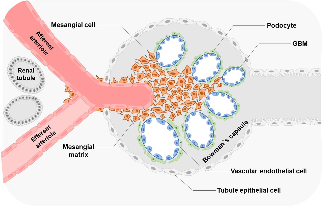 대식세포 中 FOAM CELL이 성장인자(TGF-B1)분비 = 신장 혈관간세포(kidney mesangial cell)을 미분화세포인 blast cell로 분화시킴 = ECM을 분비하게 됨 = 사구체경