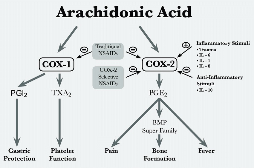 - COX-1의 중요한 부위는 혈소판(platelet)이며 트롬복산(thromboxane) 합성에 필요한 전구체를 제공.