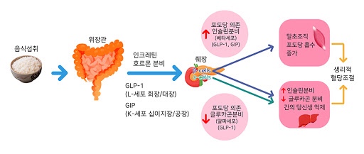인크레틴에는 크게 글루카콘양 펩티드-1 (GLP-1)과 glucose- dependent insulinotropic polypeptide (GIP)가 있는데, 췌장 β세포에서 발현되는 G단백결합수용체를 통해 인슐린 분비 작용이 일어난다.