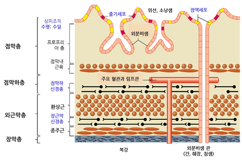 위장관 운동은 벽을 구성하는 평활근세포에 의해 발생한다. 이러한 평활근은 점막하근육층, 안쪽의 윤상근, 바깥쪽의 종주근으로 구성되어 있으며 점막하층의 점막하 신경총과 종주근과 윤상근사이의 근층간 신경총에 의해 지배된다. 근층간 신경총은 주로 운동성에 영향을 미치지만 점막하 신경총은 운동성과 분비에 모두 영향을 미친다. 위장관운동은 입에서 항문으로 음식물을 진행시키는 연동운동, 음식물과 소화액을 섞어주는 비추진 연동운동(non-propulsive peristalsis), 분절운동(segmentation movement) 및 시계추운동(pendular movement)으로 구성된 교반운동(mixing movement)으로 구성된다. 분절운동은 윤상근이 어느 정도 간격을 두고 동시에 수축을 하여 음식물과 소화액을 섞어주는 운동을 말하며 시계추운동은 종주근이 수축을 하여 장관의 길이를 단축시켜 점막을 미즙상에서 미끌어지게 하는 운동을 말한다. 이외에도 괄약근에서 주로 볼 수 있는 지속적 긴장성 수축은 기능적으로 서로 다른 부위를 분리시키며 역류를 방지하는 효과를 지닌다.
